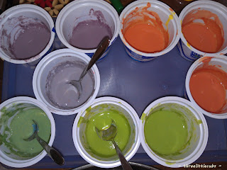 Here, they are busy stirring the colour mixture and they were definately amazed with the result (secondary colours).